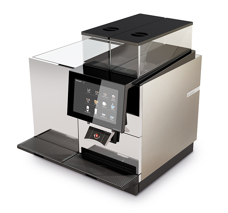 Efficient and fully automatic coffee maker with two bean hoppers and a 7-inch touch screen.
